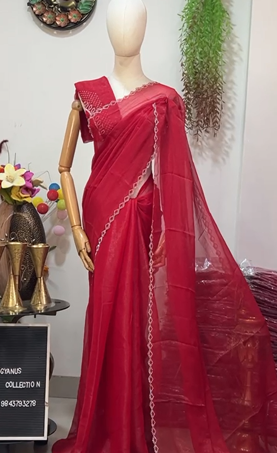 Elevate your elegance with this stunning Simmer Saree, meticulously designed to make a statement at any event. Accompanied by a beautifully coordinated blouse, this outfit will surely turn heads while you embrace the perfect blend of tradition and contemporary style. Crafted from sheer, glossy fabric, this saree reflects a desirable sheen that catches the light beautifully, making it an ideal choice for festive occasions and celebrations.